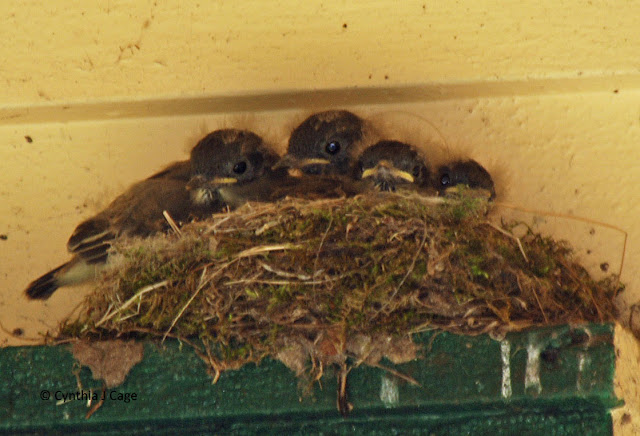 In Maine, where I try to escape to as soon as school is over, we found a nesting Eastern Phoebe over the kitchen door. It is the perfect place; a small ledge under/protected by a porch. The first day there I could see two little beaks coming up when mom arrived, but mom was also still sitting. A couple days later I could make out three babies. On the last day as I took pictures there were four babies with open beaks!
